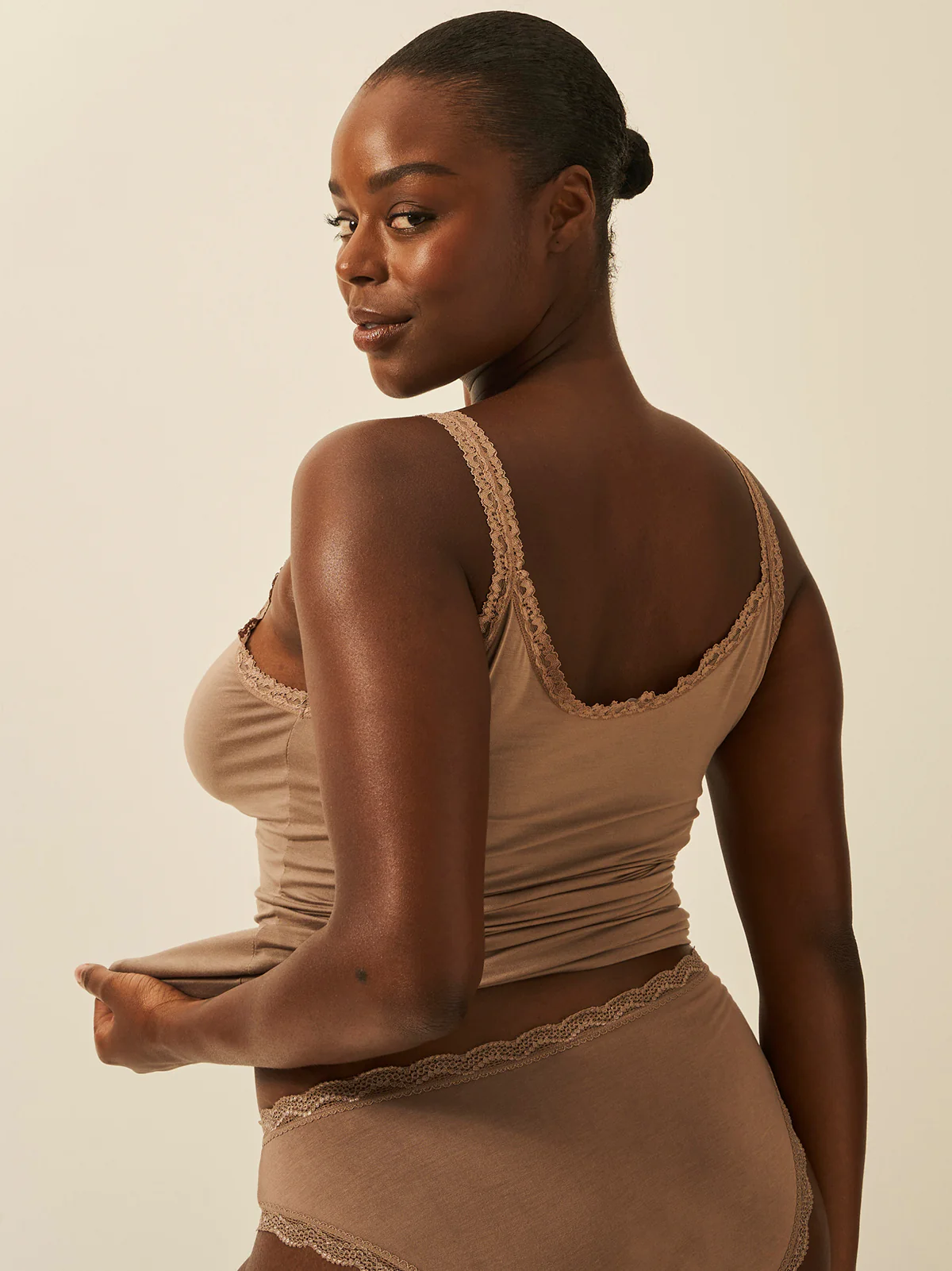 The Lace Cami in Taupe is dangerously soft - and totally versatile. Made from our signature fabric that feels like a second skin, it’s lightweight, breathable, and effortlessly comfortable all day long. Wear it solo, layer it under shirts, or slip it on as your go-to bedtime staple - either way, it moves with you, feels heavenly, and adds a touch of delicate elegance with its lace trim. Seriously, this is the one you’ll keep reaching for, day after day.